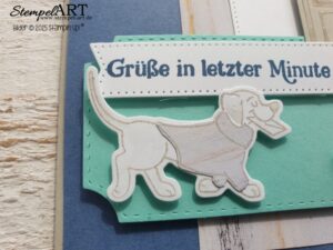Den „Pullover“ des Hundes habe ich mit der „Paper Piecing Technique“ gestaltet, dadurch wirkt er plastisch und kommt schön zur Geltung! Möchtest Du einen bunten Pullover, dann stempel einfach auf einen Rest klein gemustertes Designerpapier 😉 .