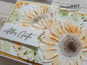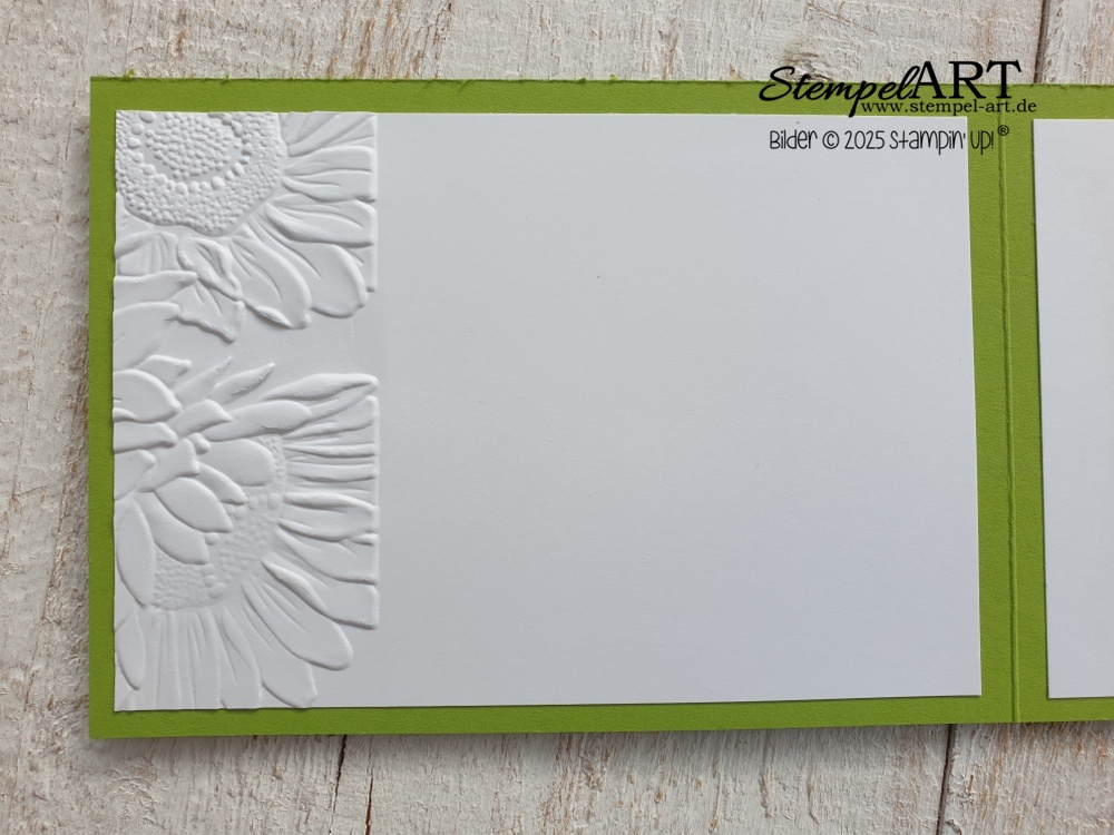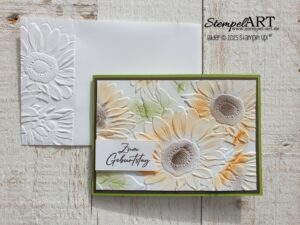 Die Prägeform Sonnenblumenfeld ergibt wunderschönes, plastisches Motiv, das auch ohne weitere Einfärbung schon toll aussieht, wie Du hier am geprägten Briefumschlag erkennen kannst…