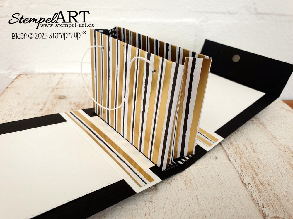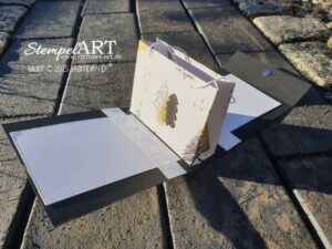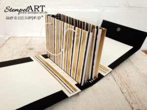 Öffnet man die Karte, dann stellt sich im Inneren die Geschenktüte auf – ein absoluter „Wow – Effekt“, mit dem der Beschenkte sicherlich nicht rechnet 😉 .