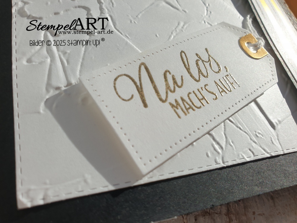 … ganz schlicht, das Designerpapier wird wieder nur durch geprägtes Papier und einen Anhänger mit passendem Spruch ergänzt.